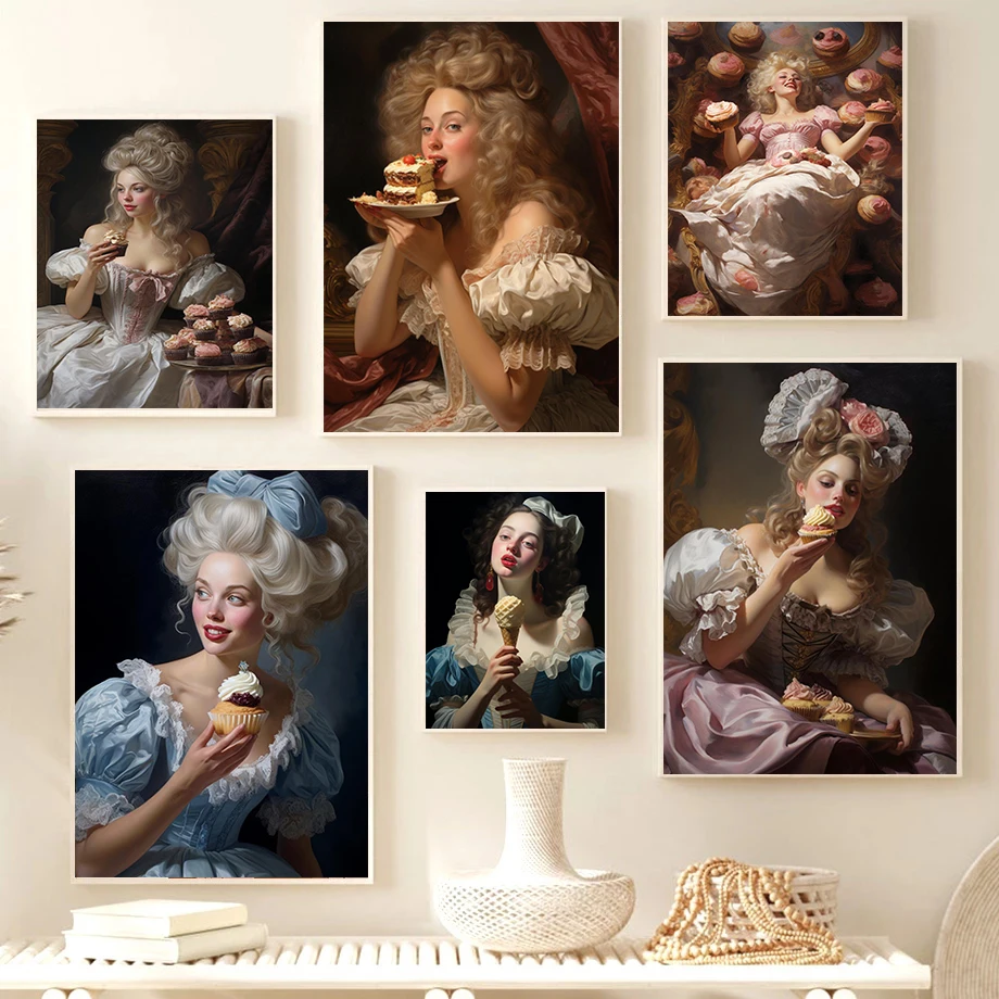 Medievale elegante signore e dessert poster stampa retrò giocoso stile rococò gelato ciambelle tela pittura decorazioni per la casa