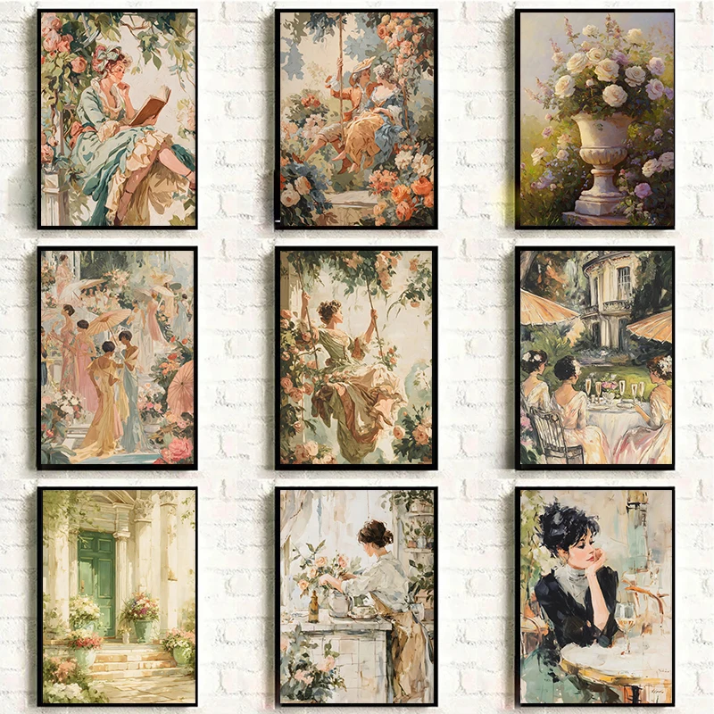 Classico maniero francese NobleWoman Party Bellissimo altalena Rococò Garden Romance Poster Dipinti su tela Immagini di arte della parete Decorazioni per la casa