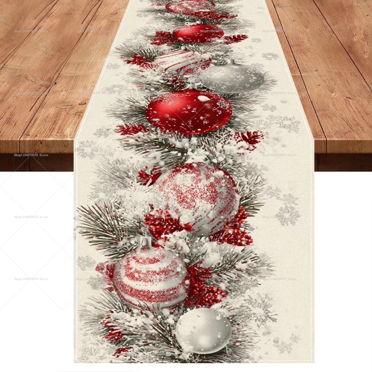 Un runner da tavola natalizio in rosso e argento con un design a ramo di pino ricoperto di neve, stampa piatta, perfetto per la stagione festiva