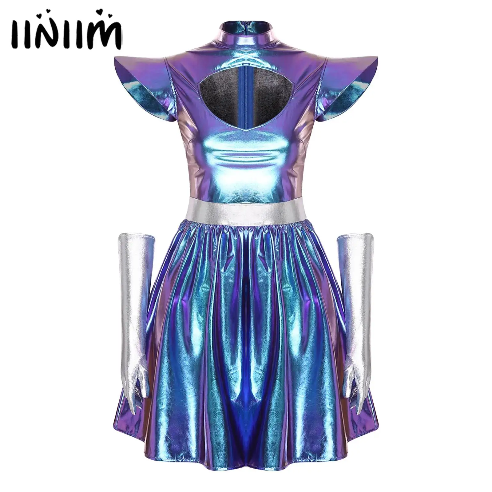 Costume cosplay da astronauta alieno da donna, spazio esterno, abito metallizzato lucido con guanti, spalline strutturate, abito a trapezio