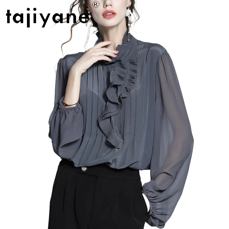TAJIYANE Camicetta 100% Seta di Gelso da Donna, Lusso, con Volant, Top Elegante, Camicie Grigio Blu alla Moda, Nuovi Abiti Primaverili da Donna 2026 블라우스