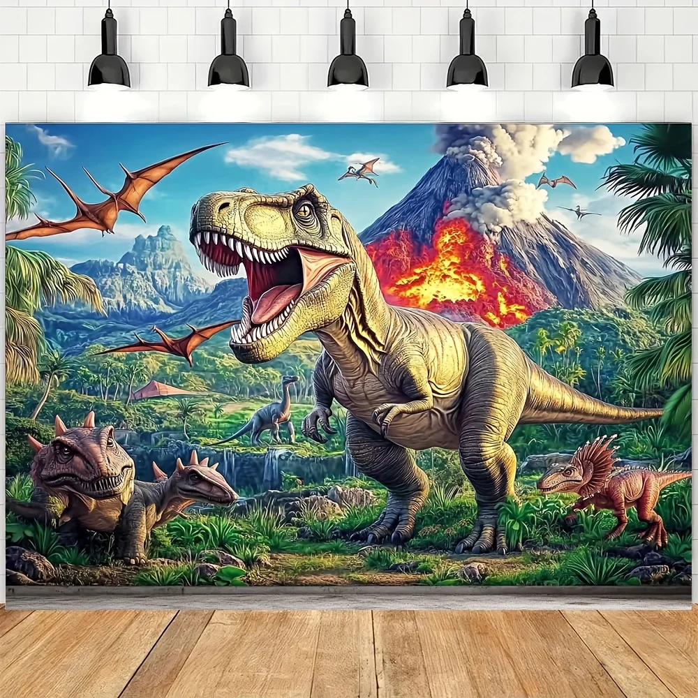 Murale da parete piatto 2D, 1 pezzo di dinosauro giurassico - Sfondo di eruzione del vulcano T-Rex e Stegosaurus, decorazione a tema Dino Jungle per