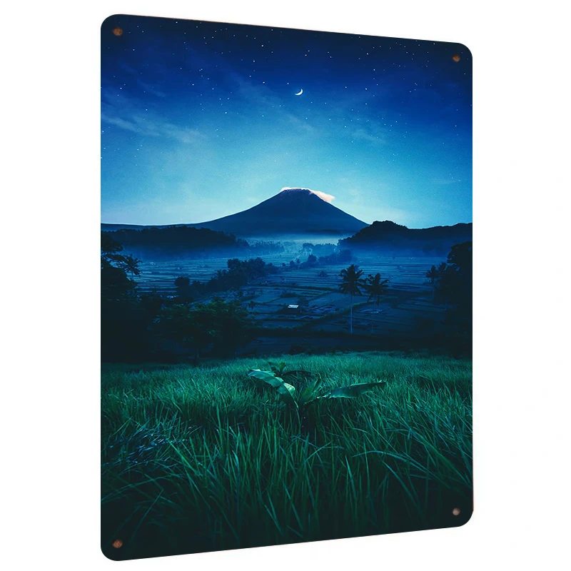 Vulcano notturno e campo di riso Paesaggio Arte da parete in metallo Decorazione domestica moderna e minimalista per soggiorno