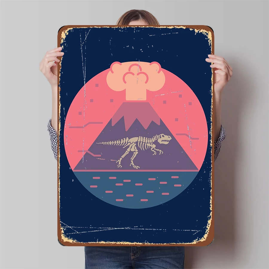 Vintage Jurassic Dinosaur Scheletro Metallo Wall Art Vulcano Eruption Home Decor Soggiorno Decorativo Ornamento da appendere