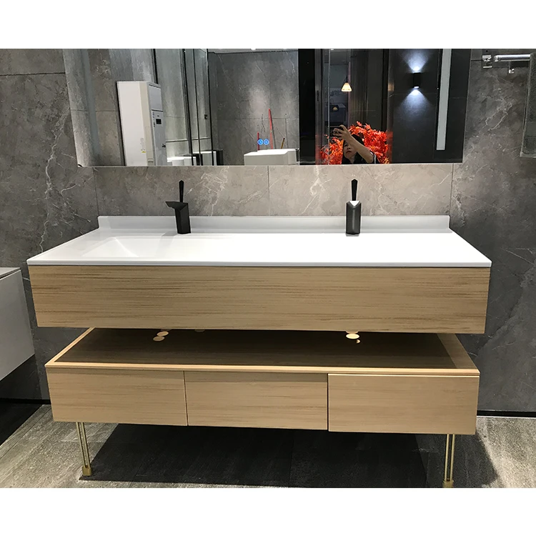 Moderne badkamer zwevende wastafel opbergkast set dubbele wastafel wit eiken massief houten muur opgehangen badkamerijdelheid kast