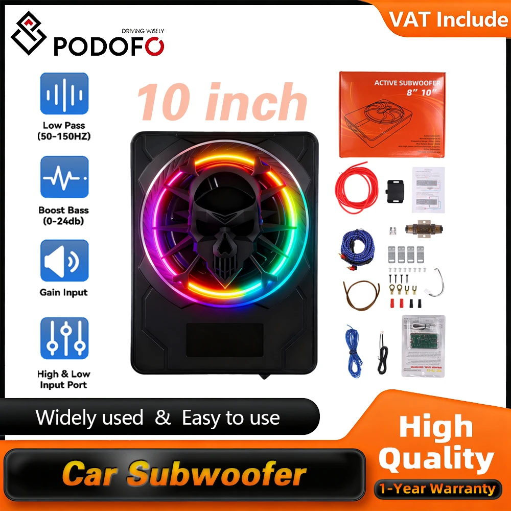 Podofo 10-inch ultradunne auto subwoofer versterker 1200W onderstoels auto audio autoluidsprekers auto subbox systeem RGB LED verlichting