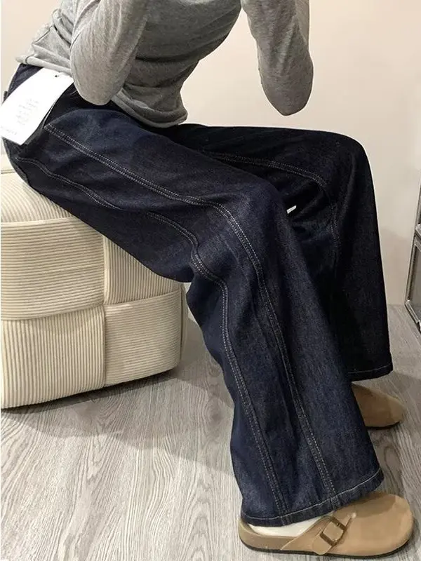Diepblauwe textuur rechte pijp jeans dames high waist wijde pijp lange broek herfst nieuwe stijl plus size heupbedekkend