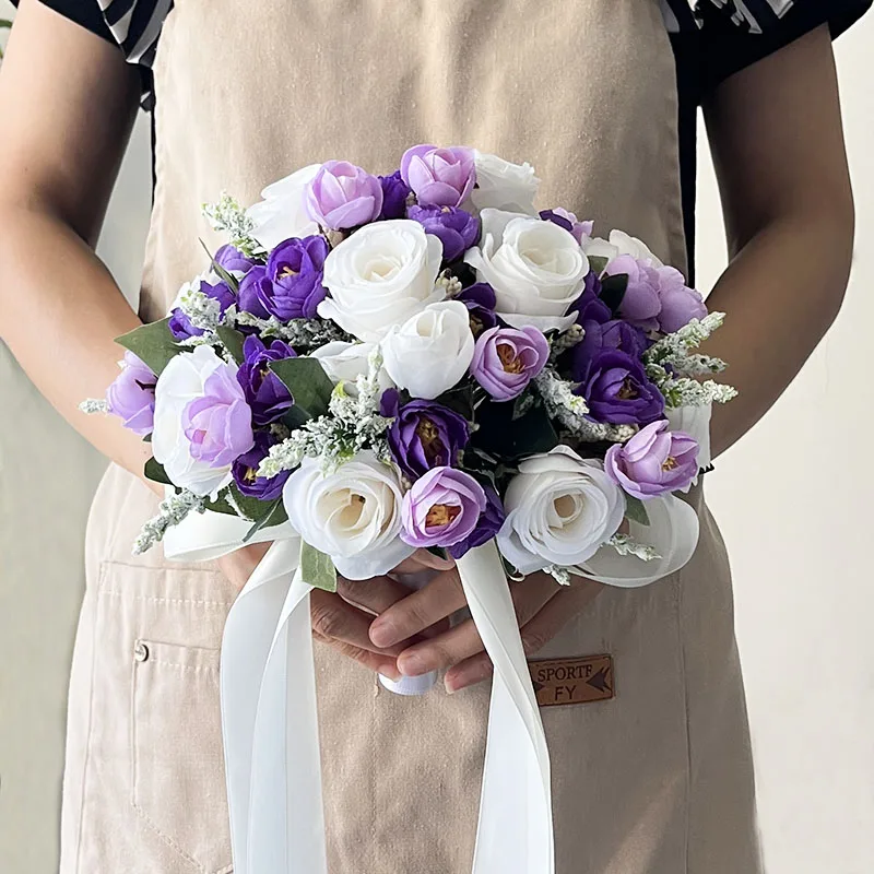 Bruid Bruidsmeisjes Bruidsboeket Huwelijksaccessoires Aanpasbare zijden rozen Wit Paars Kunstbloemen Feest middelpunt