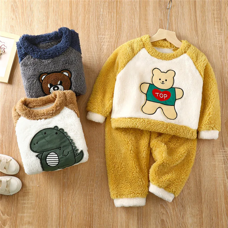 Kinderen Flanellen Pyjama Sets Lange Mouw Stijlvol Veelzijdig Warm Koraal Fleece Kinderen Cartoon Dinosaurus Winter Comfortabele Homewear