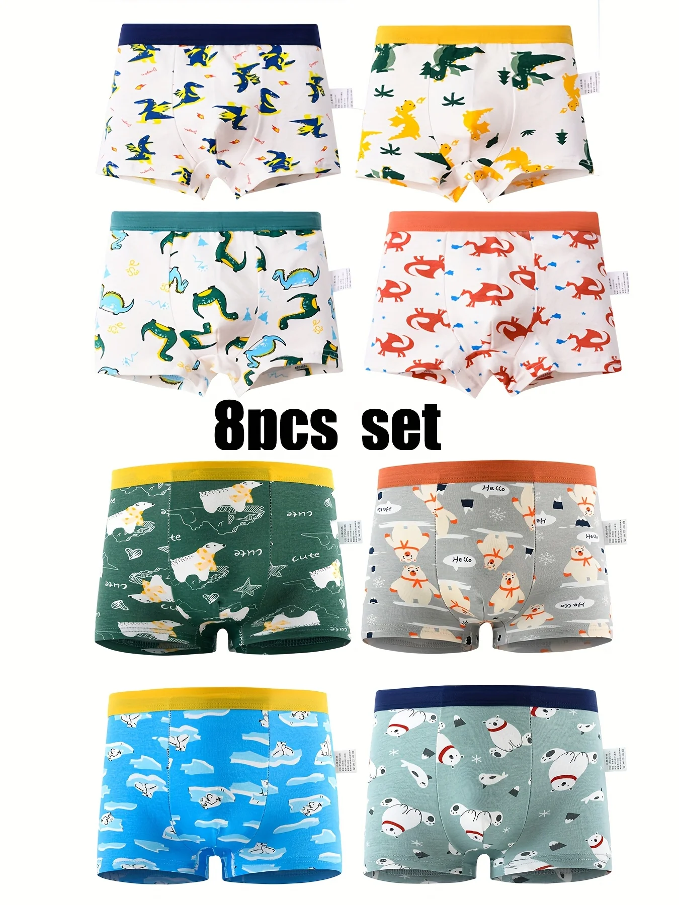 8-delige set schattige cartoon onderbroeken voor jongens met comfortabele en zachte, vierkante dinosaurus-teddybeer shorts