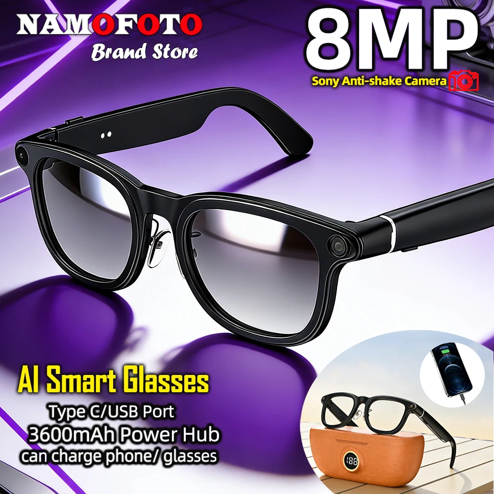 2026 Nieuwe AI Smart Glasses 8MP 6-Axis Anti-shake Camera 1200P Video-opnames Fotochromatische Lenzen 3600mAh Powerbank met Display