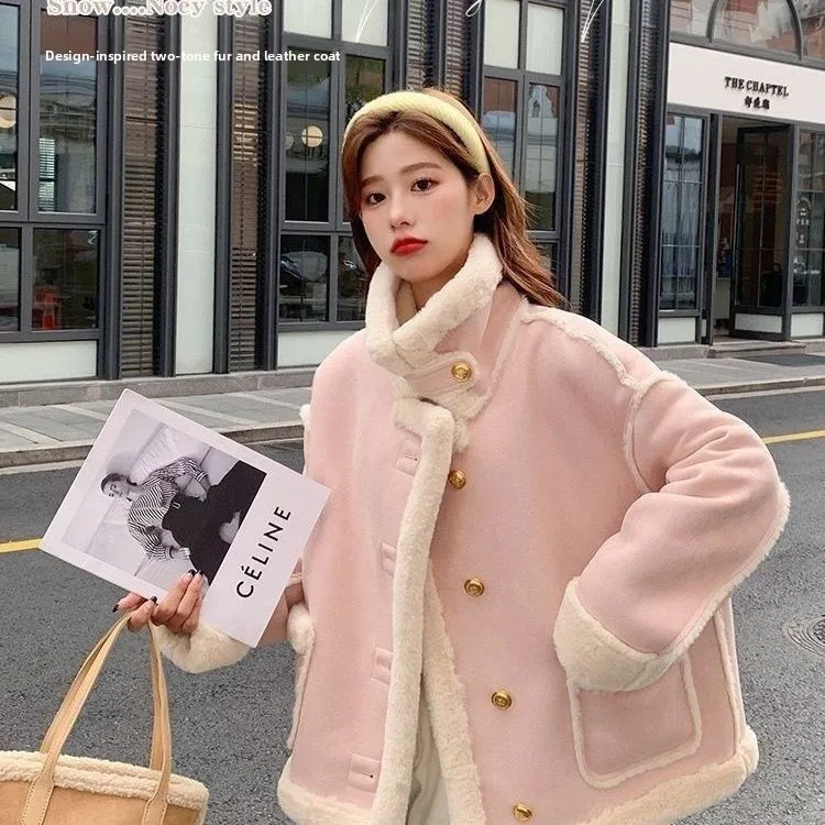 Roze lamsbontjas Dames korte winterjas Koreaanse stijl katoenen kleding Casual stijl Normale dunne korte jas