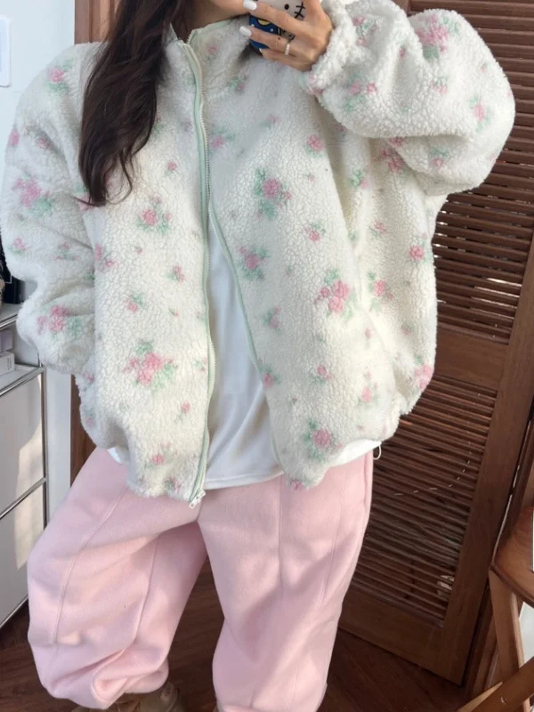 Koreaanse Sle Sweet Jeugdige bloemenkraag van lamsbont Katoenen jas Dames wintermode chic design jas losse pasvorm met ritssluiting