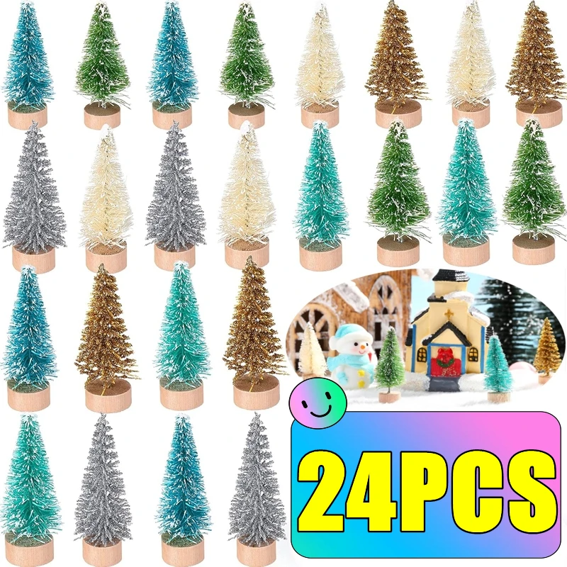 12/24PCS Mini Pijnboom Kunstmatige Mini Bomen met Houten Basis Sisalboom Flessenborstel Bomen Winter Sneeuw voor Kerst Decoratie