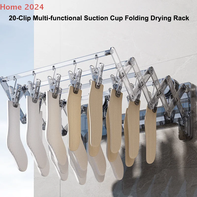 Sokkenrek met zuignap, onzichtbaar en opvouwbaar, ruimtebesparend, multifunctioneel, sokkendroogrek met 20 clips, boren niet nodig.