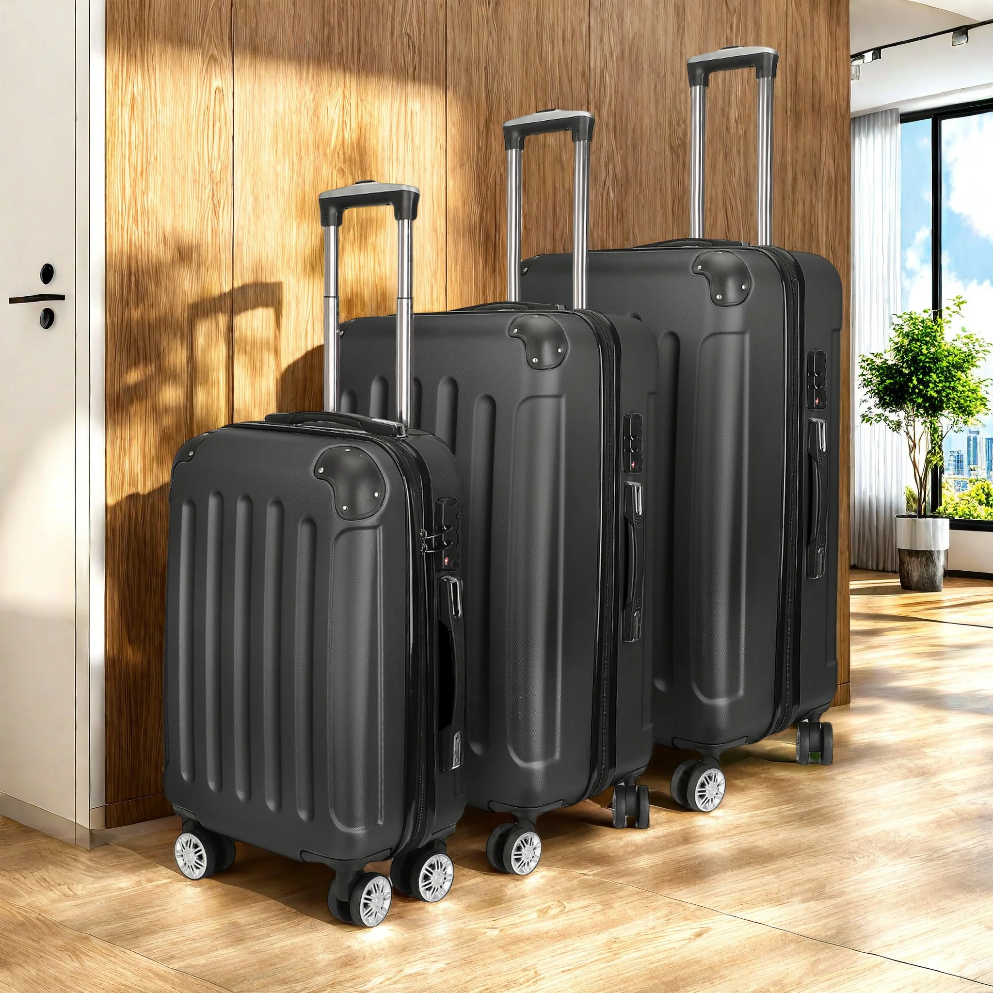 Comanlai 3-delige koffersset, ABS gestreepte hardcase koffer, trolleykoffer in zwart, reiskoffer met 4 wielen