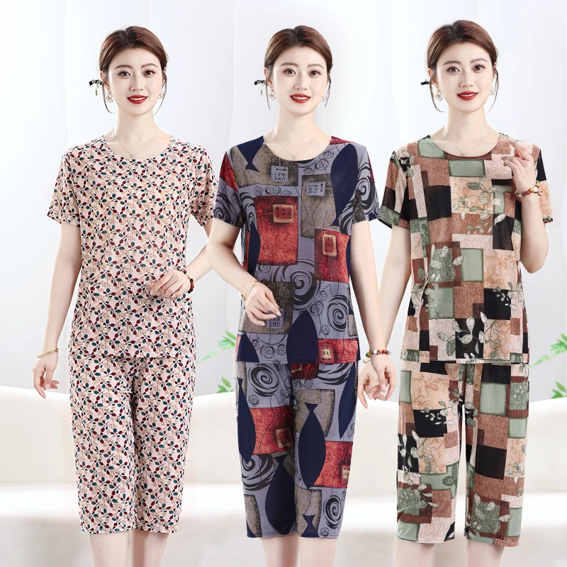 Zomer dames ijszijde thuisset T-shirt+broek Modieuze meerkleurige set Dunne Aziatische maat kleding Plus Size