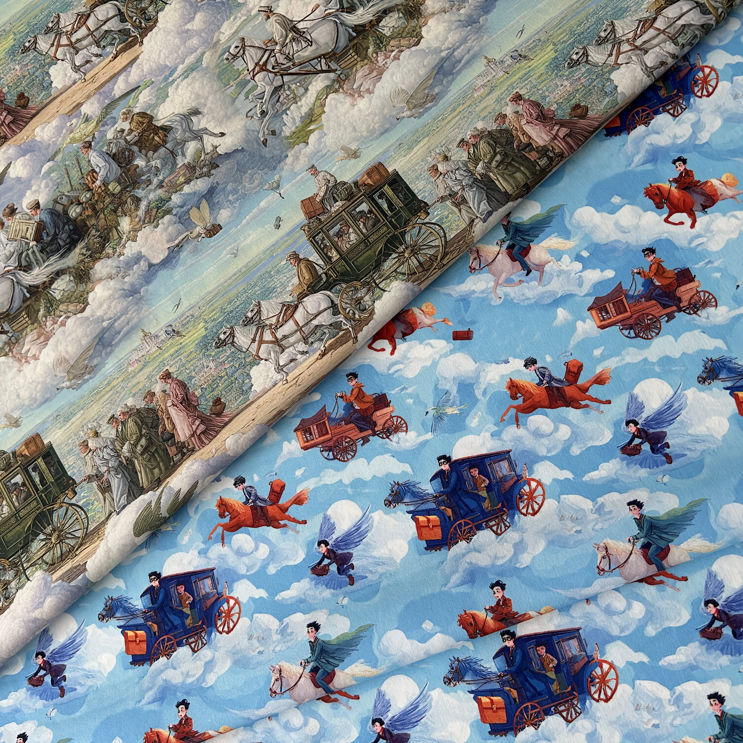 1pc, sprookjesstijl vliegende koets bedrukte stof, retro en dromerig, handgemaakt stoffen materiaal. 100% polyestervezel.