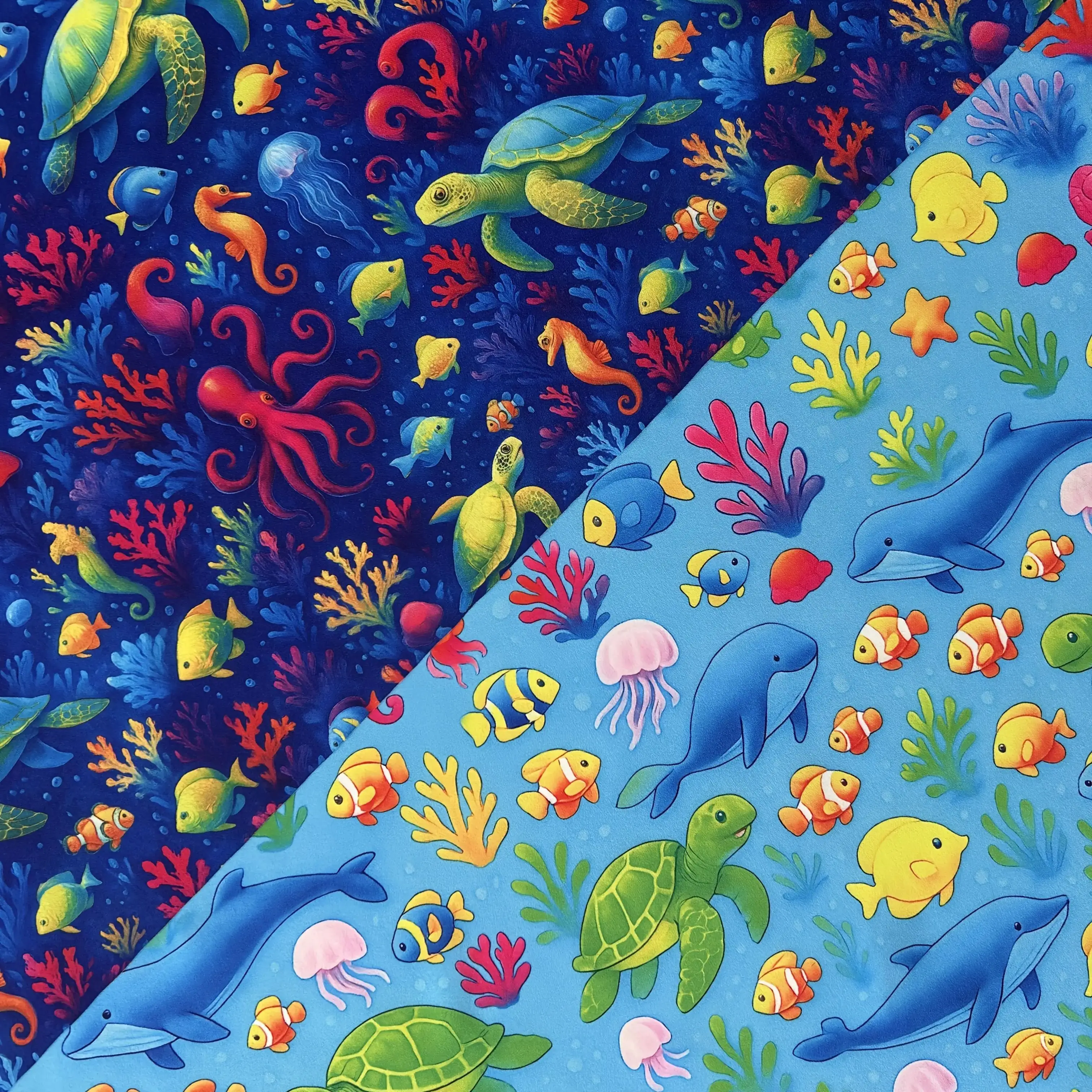 1pc, Ocean World sprookjesbedrukte stof, met verschillende koralen, dolfijnen en kleurrijke zeedieren. 100% polyester.
