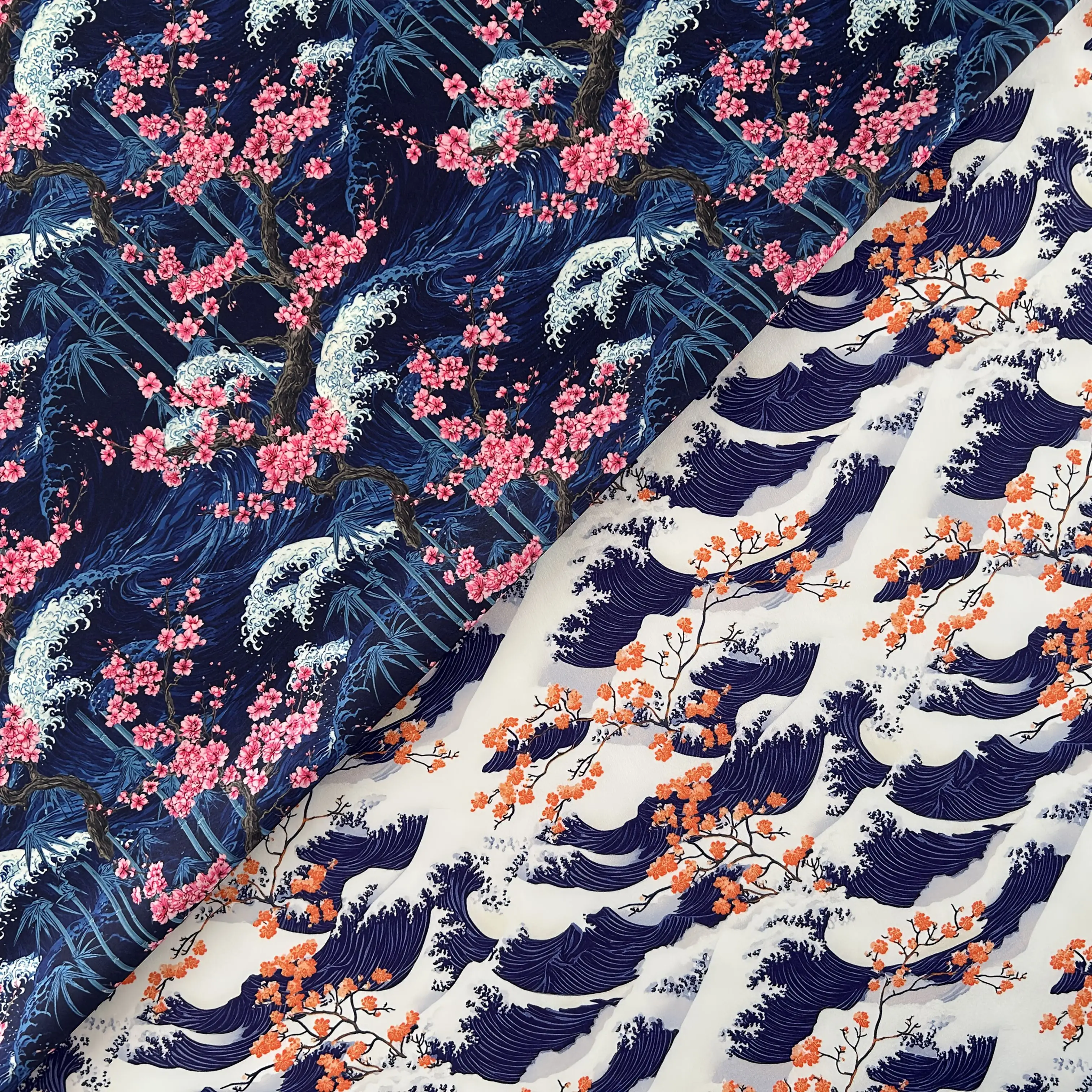 1 st, Ukiyo-stijl bedrukte stof, verweven met golven en kersenbloesems, rijk aan kleuren, met de hand genaaid stof, 100% polyester