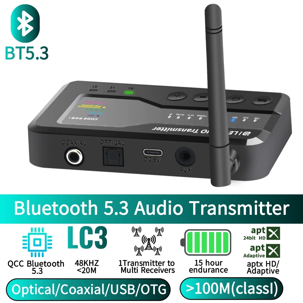 Bluetooth 5.3 audiozender, 80M afstand, aptX-adaptief, HD LC3 draadloze uitzending, 1 naar N-ontvanger, OTG USB, coaxiale AUX
