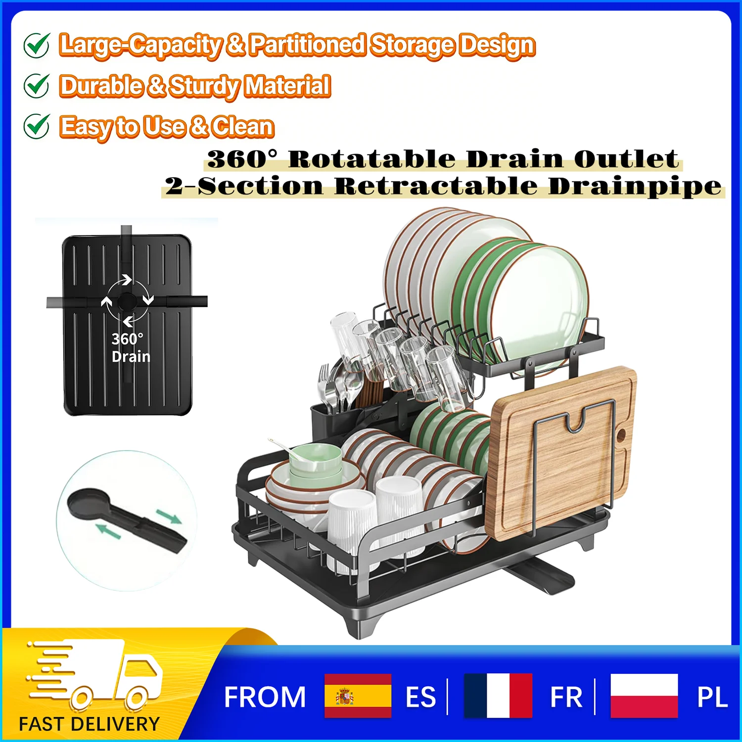 2-laags afdruiprek, dubbele compartimenten bekerhouder 360° ° Verstelbare afvoeruitloop met antislipvoetjes, afdruiprek voor aanrecht
