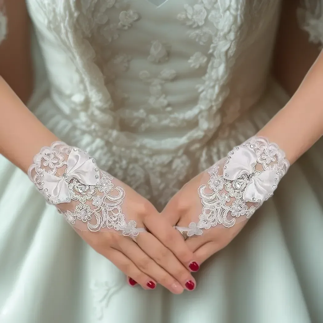 Dames Bruiloft Korte Vingerloze Handschoenen Borduren Kant Imitatie Parel Bloem Applique Lint Strik Bruidswanten Feest