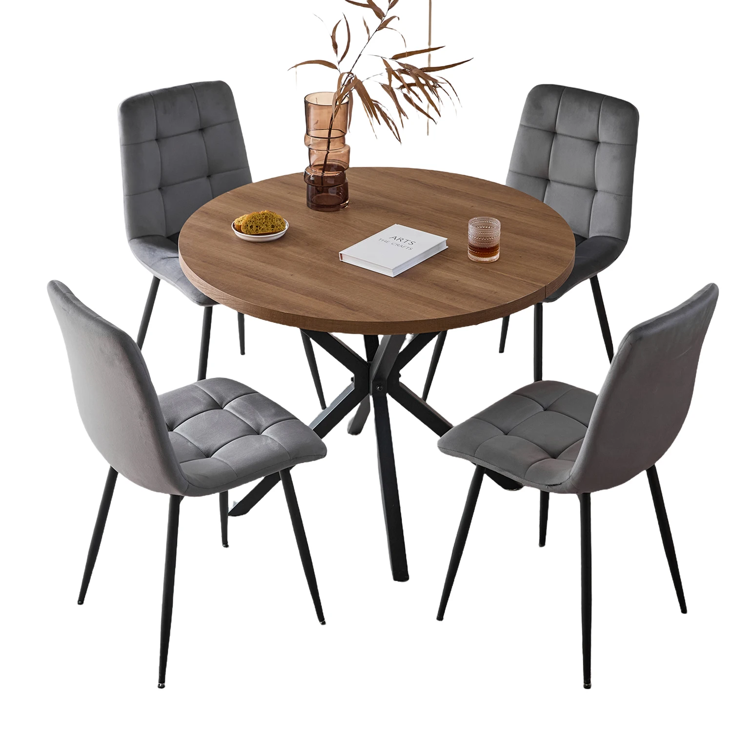 GrandCA HOME 4x fluwelen eetkamerstoelen + ronde eettafel, 100cm ronde eettafelset met gestoffeerde stoelen voor de woonkamer