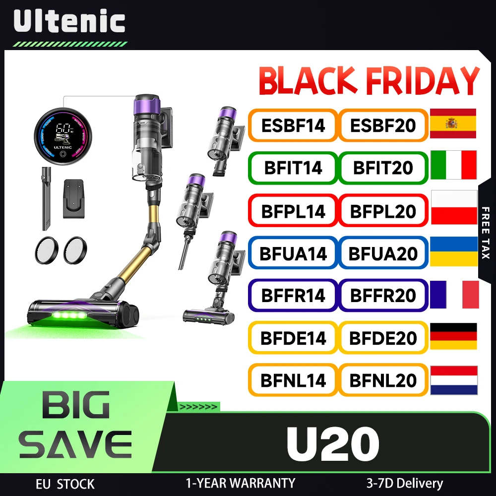 Ultenic U20 draadloze steelstofzuiger, 55.000 Pa zuigkracht, vuilnisbak van 1,5 liter, 7-traps filtratie, 60 minuten looptijd, 65 cm buigbare wand