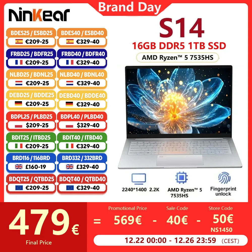Ninkear S14 laptoptablet AMD Ryzen ™ 5 7535HS 14 inch 16 GB LPDDR5 1 TB SSD Computer Notebook Wifi 6 Ondersteunt vingerafdrukherkenning