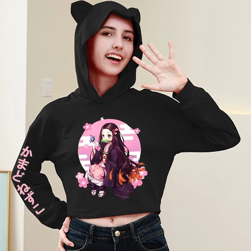 Nieuwe Anime Kamado Nezuko Afdrukken Kat Oor Hoodies Vrouwen Meisjes Mode Streetwear Hoodies Anime Sweatshirts Crop Top Trui