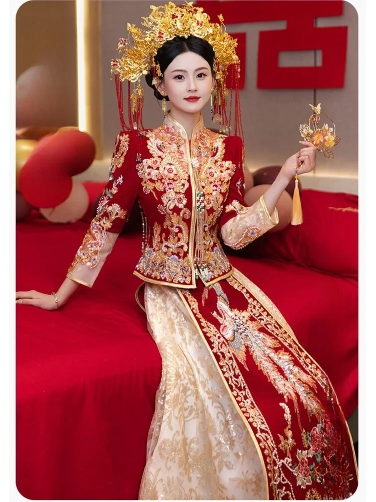Nieuwe fluwelen jurk voor bruiden Chinese stijl bruiloft gaas roosteren draak en feniks zware vrouwen