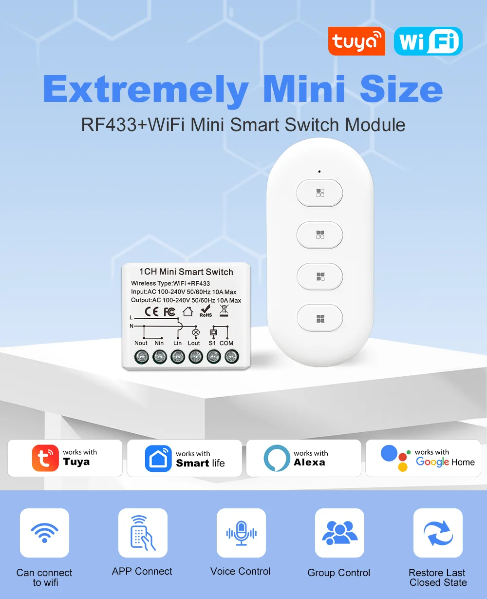 Tuya Smart WiFi + RF 433MHz Schakelmodule DIY Smart Home 10A AC 100-240V Relaisontvanger Compatibel met Alexa Google Home