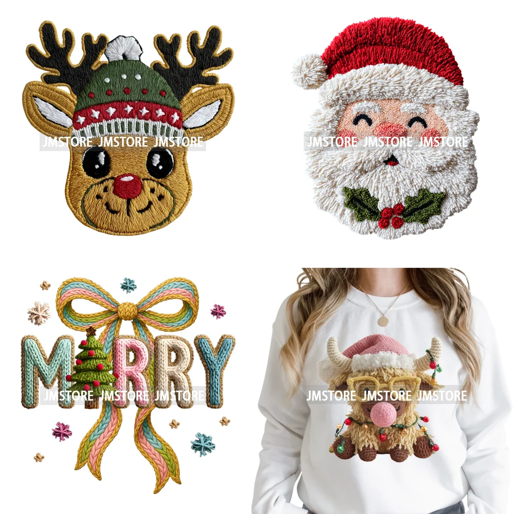 Retro Faux Garen Gehaakte Kerstboom Taart Rendier Vrolijk Kerstfeest Opstrijkbare DTF Heat Transfers Stickers Klaar om te drukken voor T-shirts
