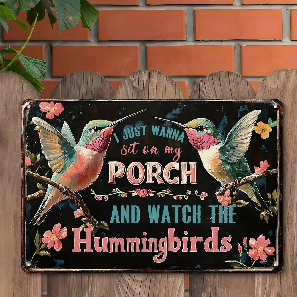 Vintage Kolibrie Veranda Metalen Tin Bord "Ik wil gewoon op de veranda zitten en kijk naar de kolibries" Ontspannend decor voor tuin