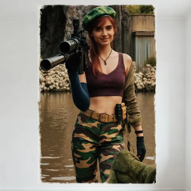 Sexy lang rood haar vrouw met groene baret en camouflagebroek blikken bord - donkerpaarse tanktop, snipergeweer, Rocky Water Backgrou