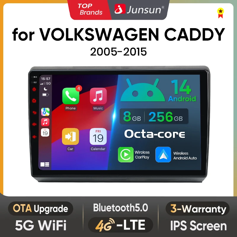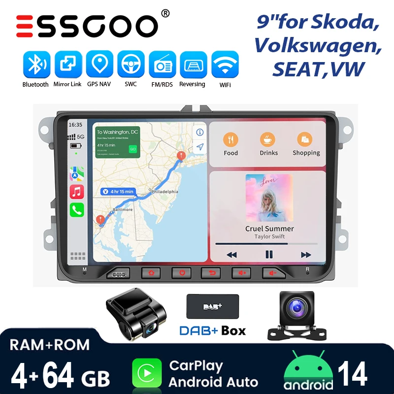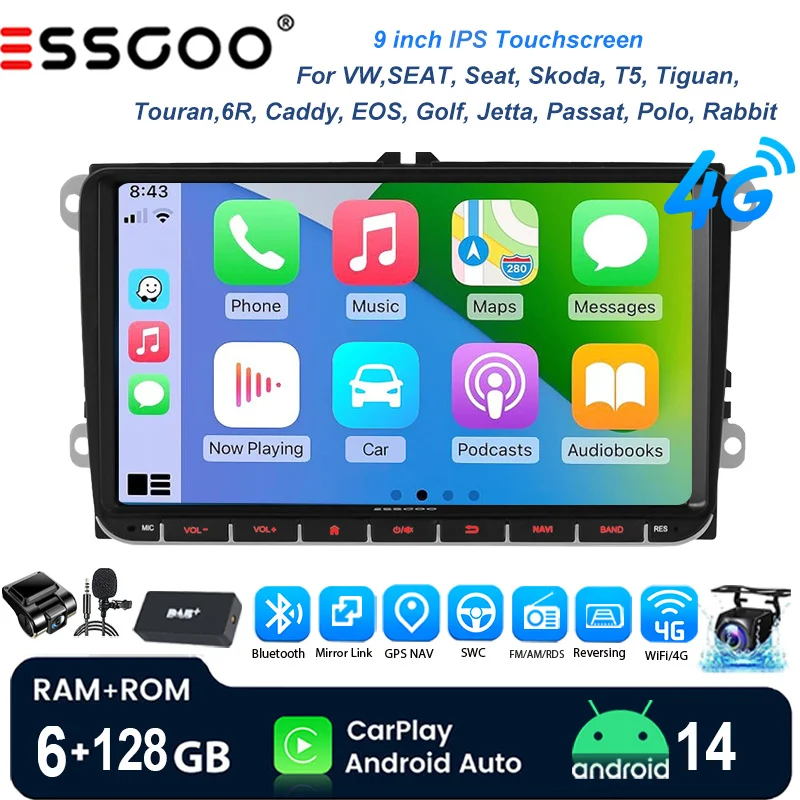 Android 14 Autoradio 9" 4+64 GB Bluetooth Draadloze CarPlay Android Auto GPS Navigatie voor VW Passat Polo Golf Tiguan Touran Caddy Eos Bora RDS WiFi Capacitief IPS-aanraakscherm