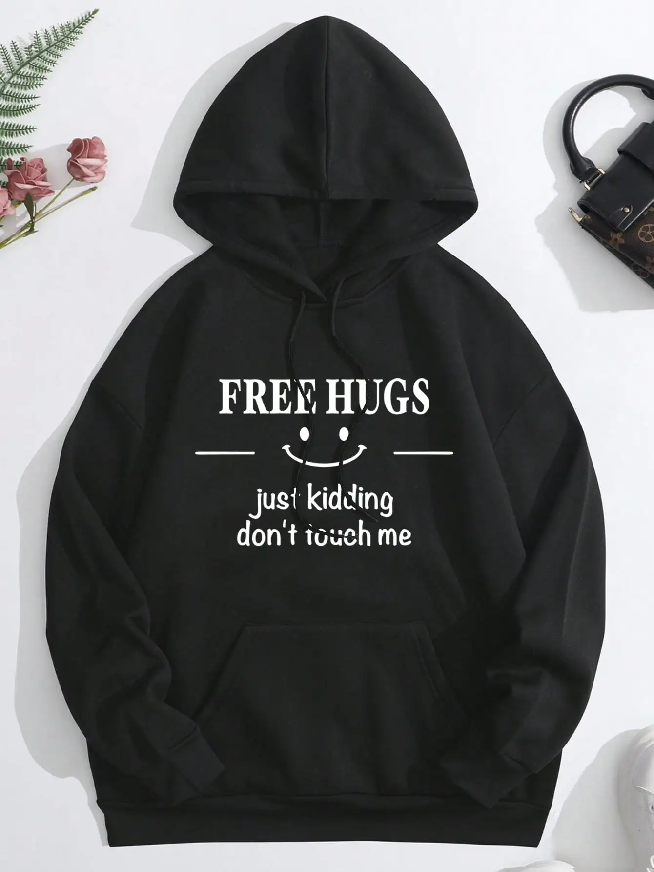 Plus Size Slogan Grafische Zak Trekkoord Thermische Hoodie GRATIS KNUFFELS Gewoon grappen Raak me niet aan Herfst Sweatshirt Dameskleding