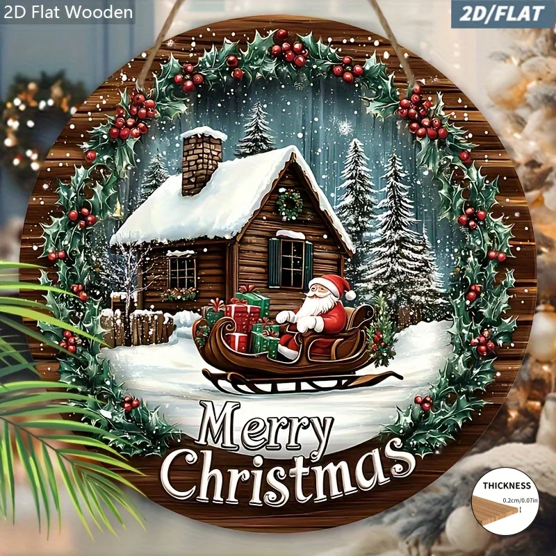 Een 2D platte kerstkrans houten bord - 2D reliëf kerstman slee scène, een klassieke vakantiedeur en wanddecoratie