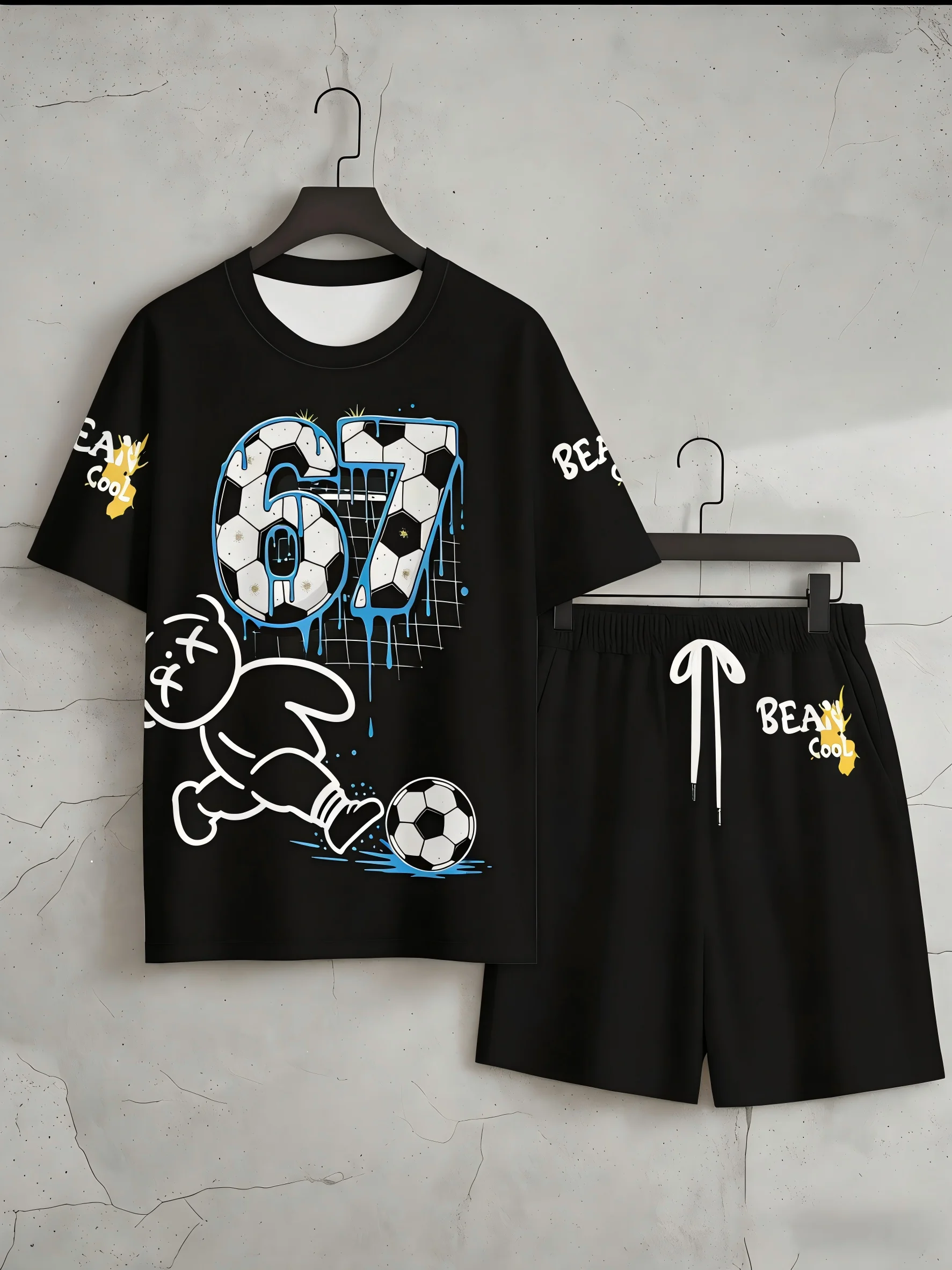 Zomerse teddybeer-letterprint voor heren, comfortabel ademend T-shirt met ronde hals, korte broek met trekkoord, casual kleding voor buiten