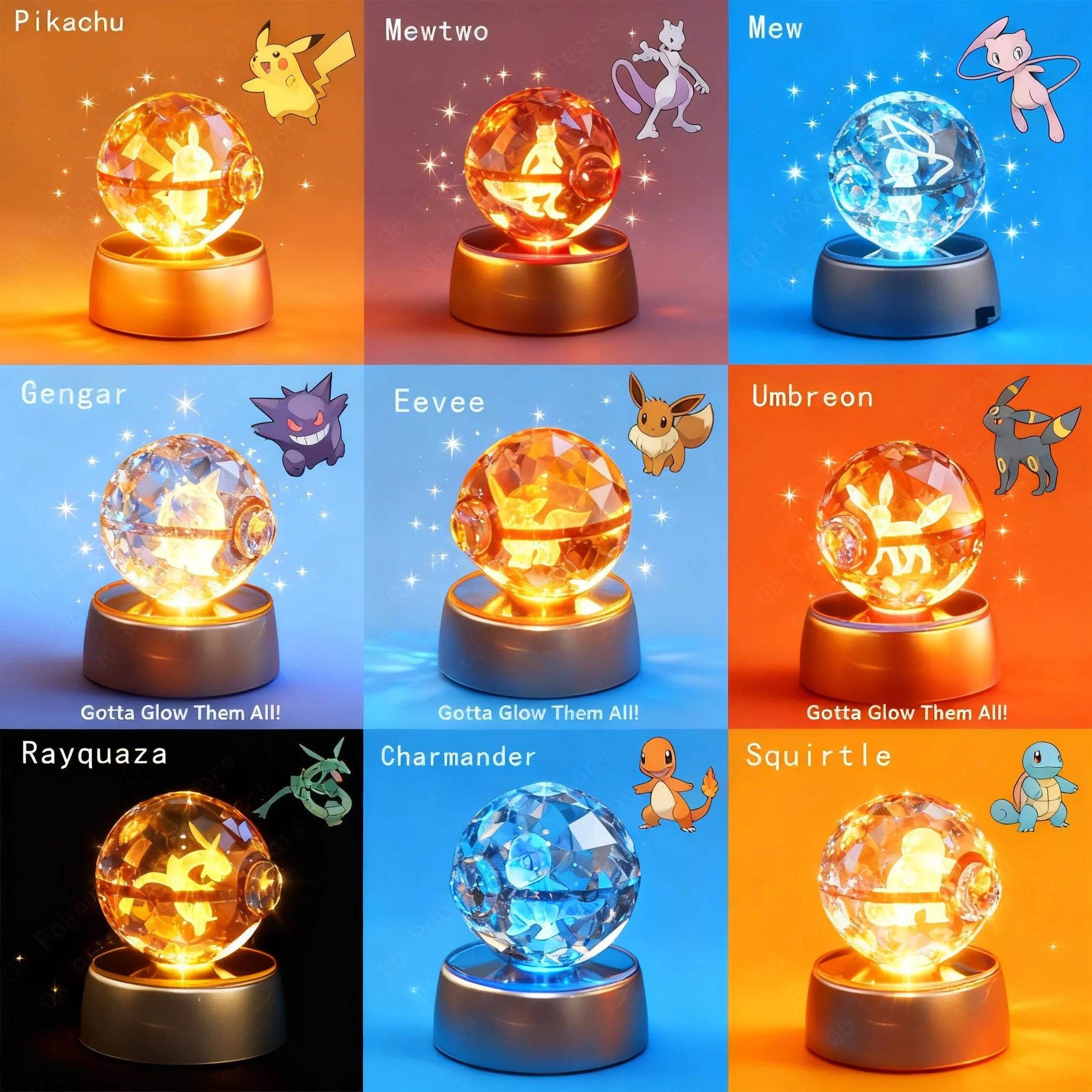 Pokemon Crystal Ball 3D Nachtlamp met Pikachu, Mewtwo, Mew, Gengar figuur, Pokeball glazen bolvoet, verjaardagscadeau voor kinderen