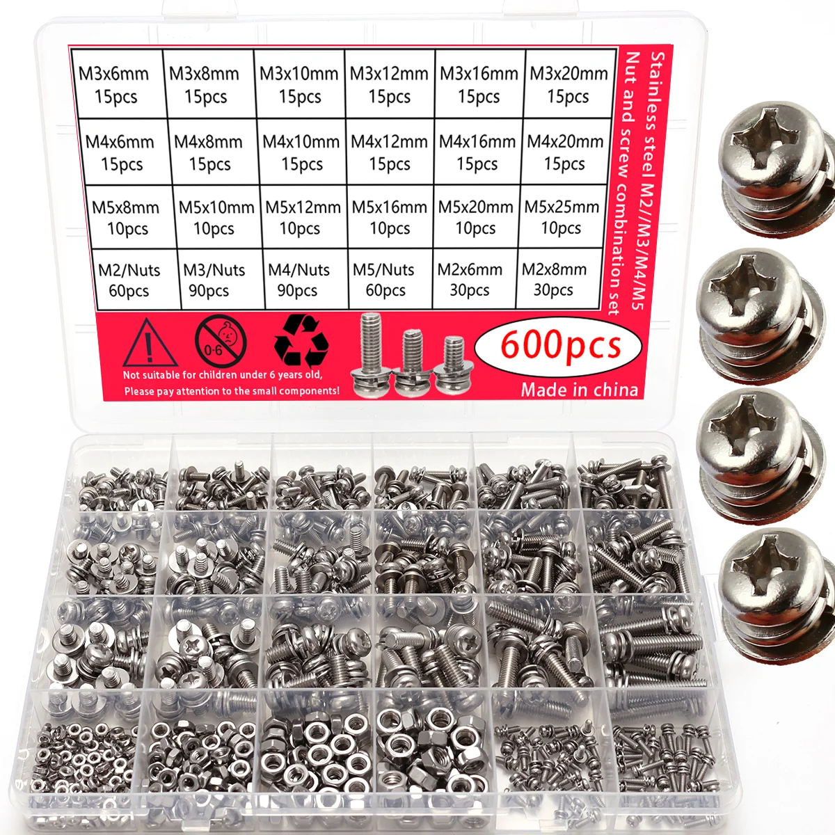 600 stuks roestvrijstalen kruiskop drie-combinatie bout en moer combinatie M2/M3/M4/M5 pankop met platte ringen
