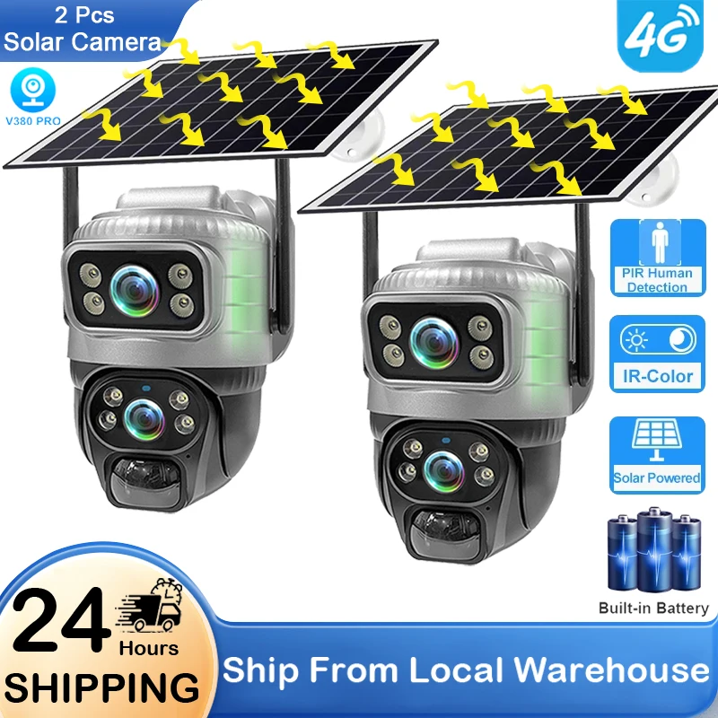 2 stuks zonnecamera 4G dubbele lens 4K draadloze buitenvideomonitor PIR menselijke detectie en alarmbeveiliging bewaking