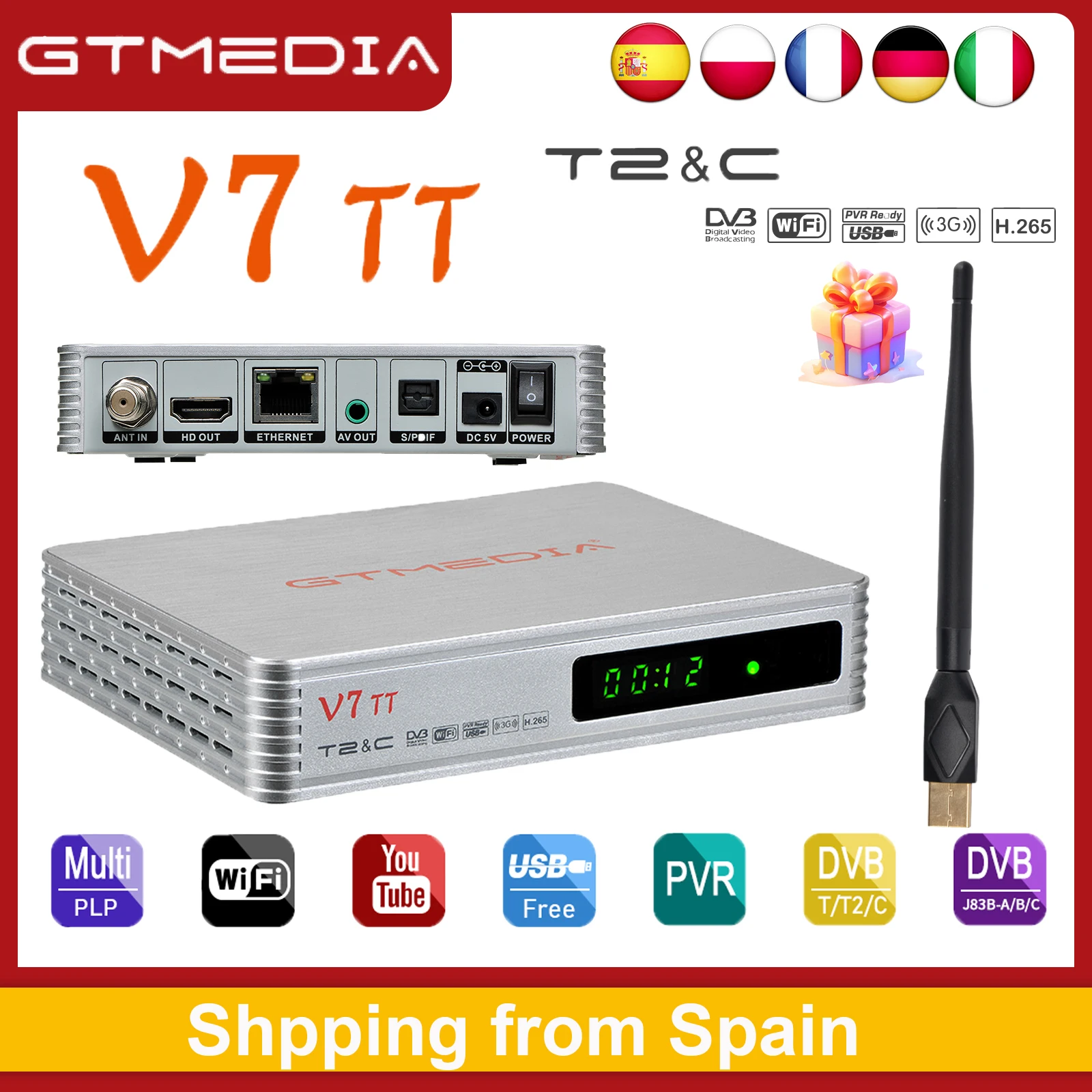 Op voorraad GTMEDIA V7 TT Satellietontvanger DVB-T/T2/-C 1080P HD H.265 HEVC 10Bit met USB WIFI PVR Ready CCAM/Newcam TV Box