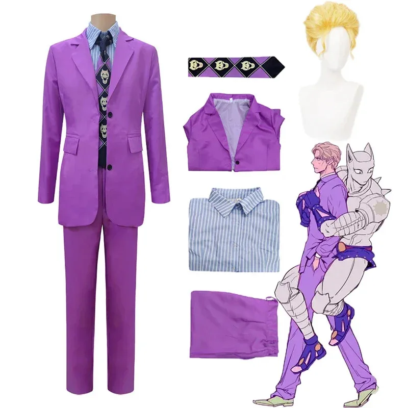 Anime Kostuum Kira Yoshikage Paars Shirt Broek Pak Krullend Geel Pruik Halloween Party Kostuums Mannen Pruiken Cosplay Ani NM32
