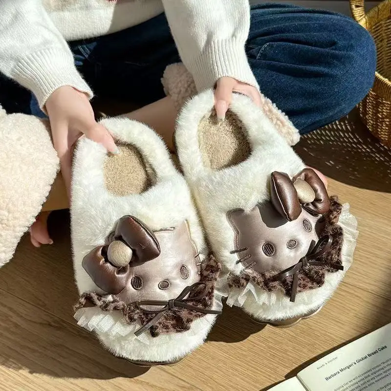 Herfst Winter Hello Kitty Y2K Meisje Pluche Platform Schoenen Antislip Outdoor Esthetische Harige Slippers Vrouwen Leuke Dikke Zool slip Ins