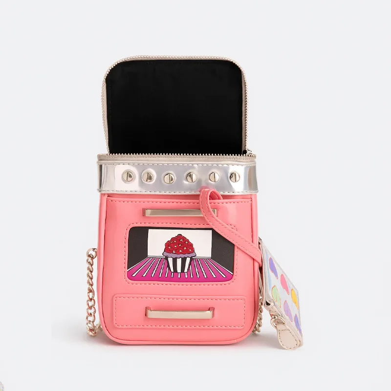 Roze telefoontas Crossbodytas met dunne ketting en schouderriem Ontwerp Contrasterende kleuren Doosvormige tas met hanger Rits Vierkante tas