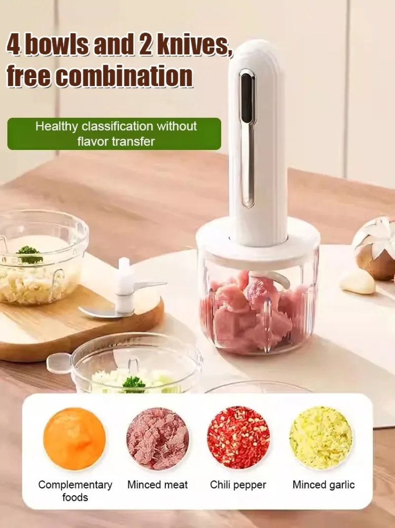 [4 kommen, 2 sneden, snel hakken in 6 seconden] Elektrische keukenmachine Mini-keukenfornuis Hoge snelheid USB oplaadbare knoflookstamper