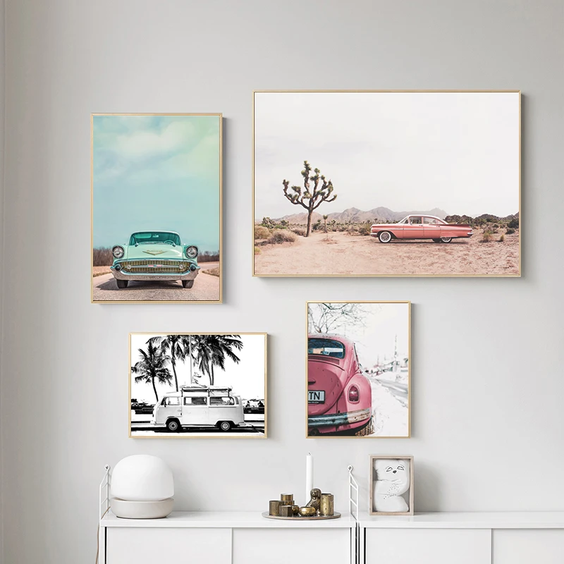 Retro Roze Bus Auto Posters Print Vintage Canvas Schilderij Woonkamer Wall Art Fotografie Muur Foto voor VW Decoratie