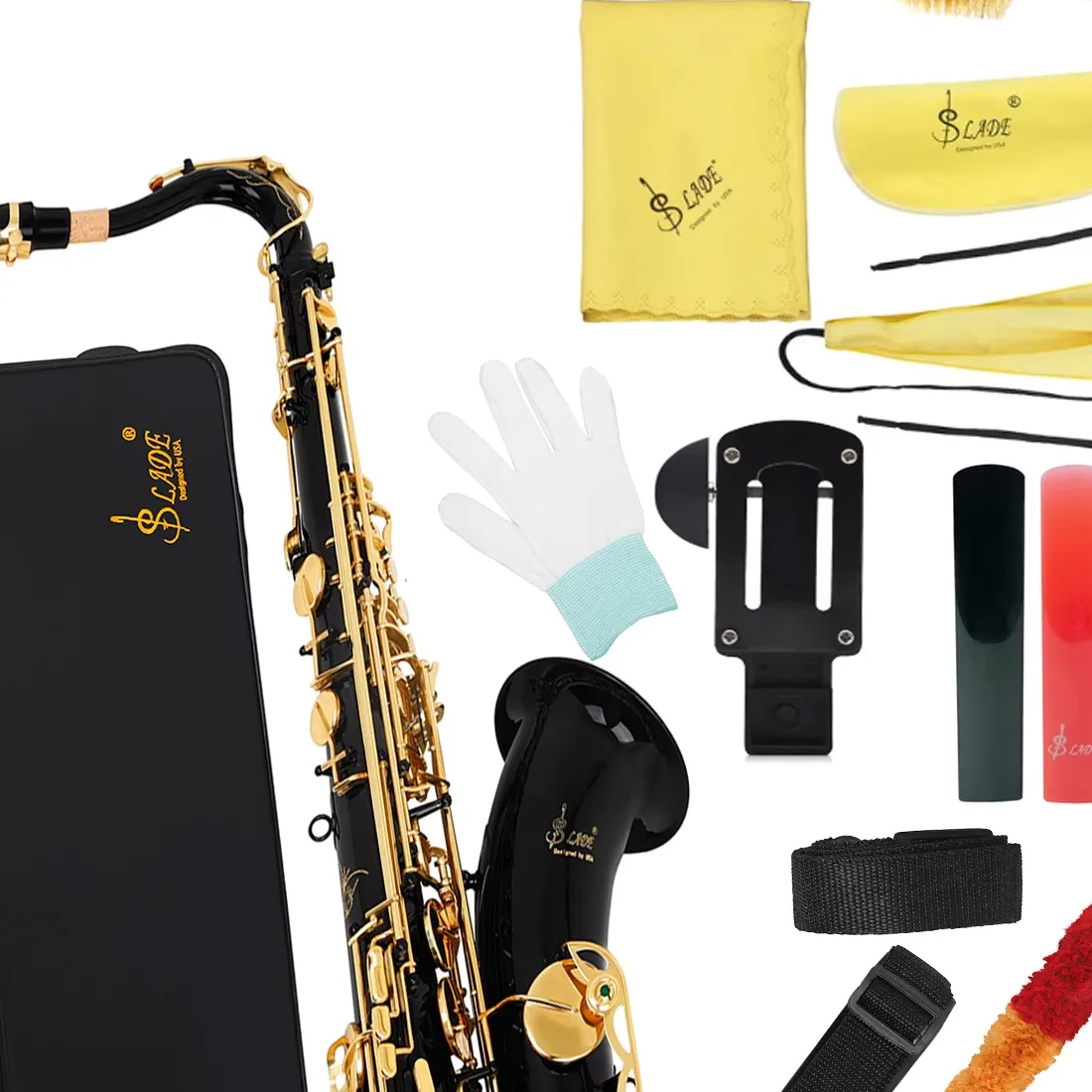 Saksofon tenorowy Black Gold, saksofon B♭ dla początkujących uczniów, z ulepszonym przenośnym futerałem, zestawem do czyszczenia, rurkami, rękawiczkami i paskiem na szyję.
